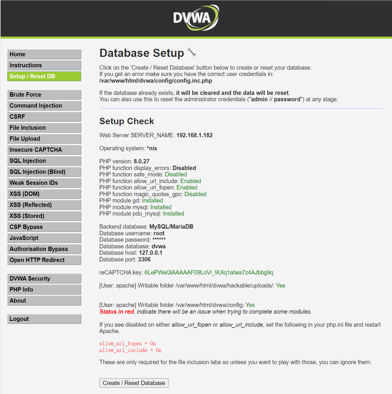 $_DVWA[ 'recaptcha_public_key' ]&$_DVWA[ 'recaptcha_private_key' ]- 需要从https://www.google.com/recaptcha/admin/create 生成